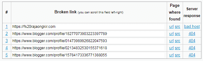 Masukan Security code kemudian pilih Find  broken  links  now. Situs broken link check akan memproses situs kita. Jika terdapat link yang rusak akan menampilkan detail seperti gambar dibawah ini.
