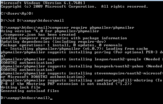Buka cmd, kemudian arahkan ke directory yang akan di instal library menggunakan composer. Contohnya kita akan mengintal library phpmailer di directory xampp/htdocs/mail. Kemudian ketikkan kode berikut ini untuk instal library phpmailer.